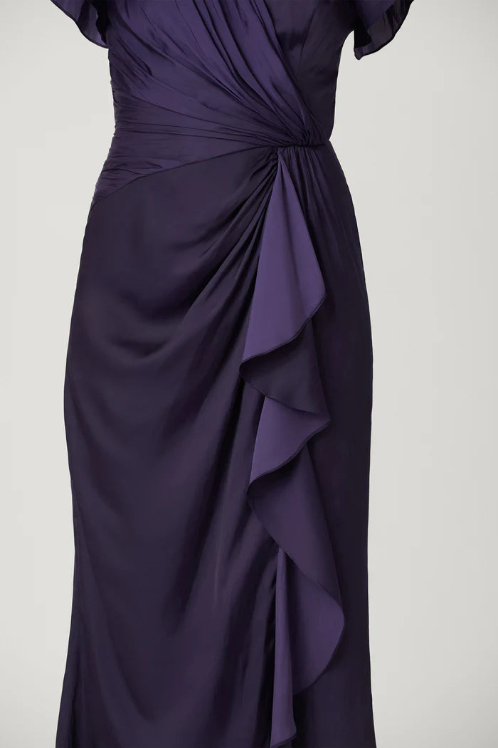 Chic satin dress with intricate draping details. This style has a crew neckline and flutter sleeve, with flattering draping on the bodice, leading into a cascading skirt with a small front slit. This lightweight and soft fabric is unlined and has a center back zipper closure.