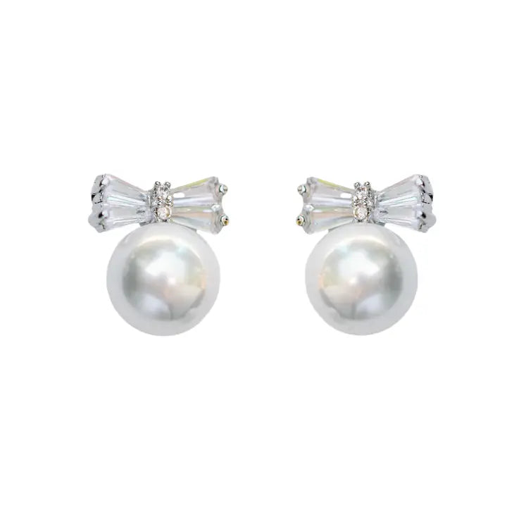 Add a playful touch to your look with our newest diamond bow pearl earrings! These mini studs feature a lustrous mini 8mm faux pearl  topped with a elegant faux diamond bow. These make a perfect ‘grab and go’ gift for the holidays!