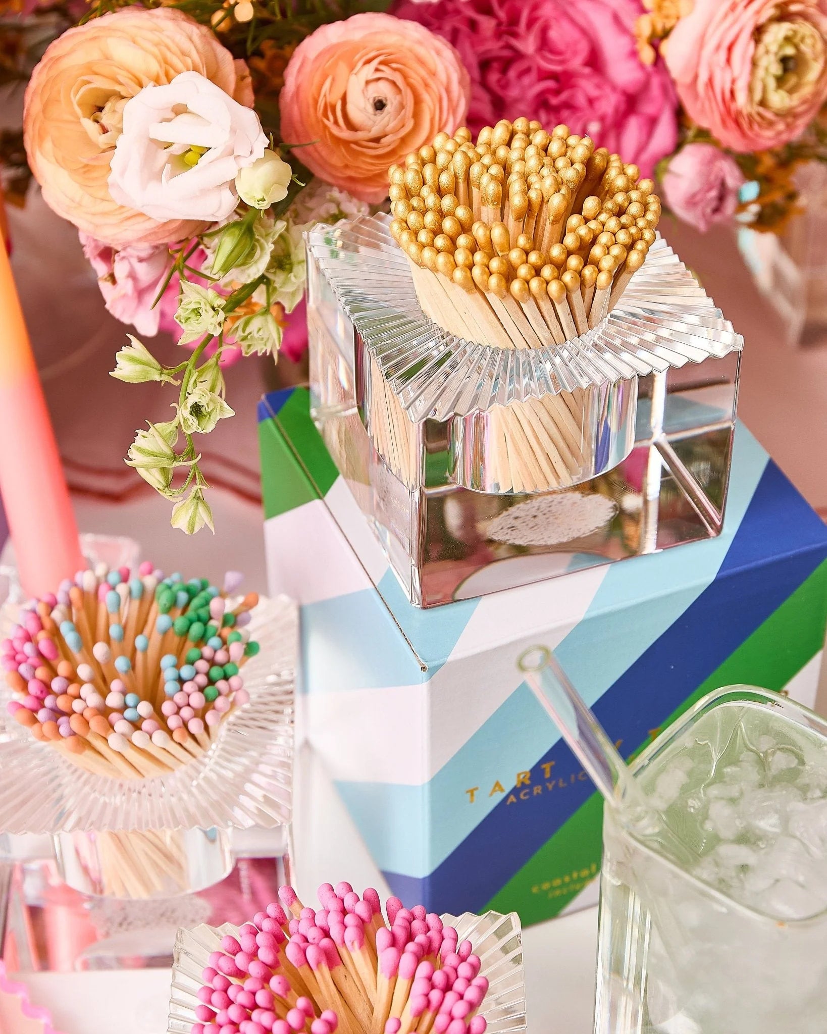 Meet your new flame! The chic square acrylic match striker is as functional as it is fabulous. Each one comes ready to light with 140 colorful matches and a built-in striker pad on the bottom of the vessel. Designed to double as décor, it’s the perfect little luxury for your coffee table, vanity, or next to your favorite candle. Refillable, reusable, and ridiculously cute - because even lighting a candle should spark joy.