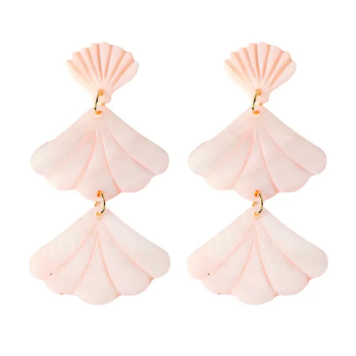 Cascading pink pearlized shells are grouped together to create a distinctively 'old Florida' look! Lightweight and perfect for Summer. 2.75" Length Faux Pink Mother of Pearl Shell Motif Post Back